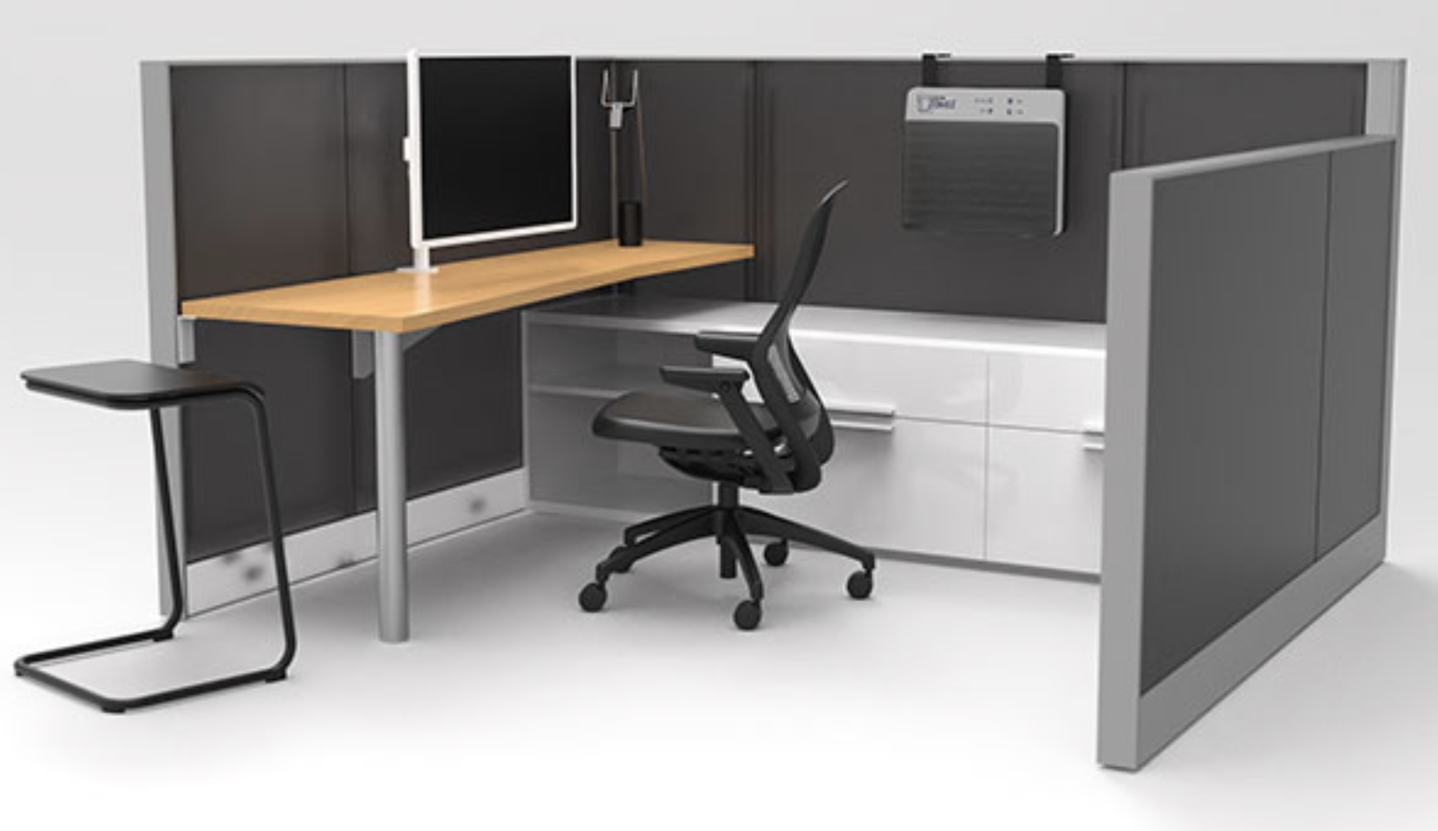 This product can be easily hung on the wall of any existing privacy pod or enclosure. It provides a level of protection that is currently not available in any privacy suite or pod. By simply mounting a bracket on the wall, plugging it in it in, and you’re ready to go.